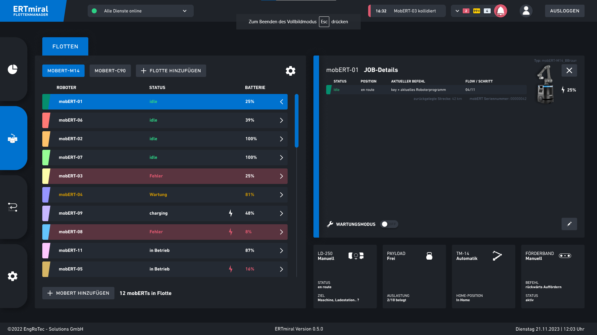 With ERTmiral®, you unlock the full potential of mobile robots on your factory floor. Our innovative order management system lets you centrally control and monitor a diverse fleet of robots from multiple manufacturers – easily, efficiently, and at scale.